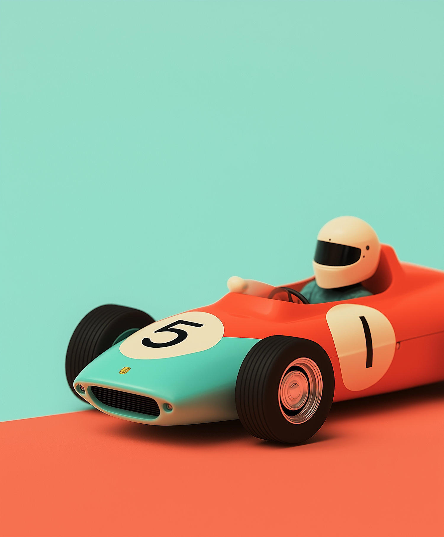 Stylized vintage race car in turquoise and orange with driver in helmet. Retro design with bold numbers and vibrant colors.