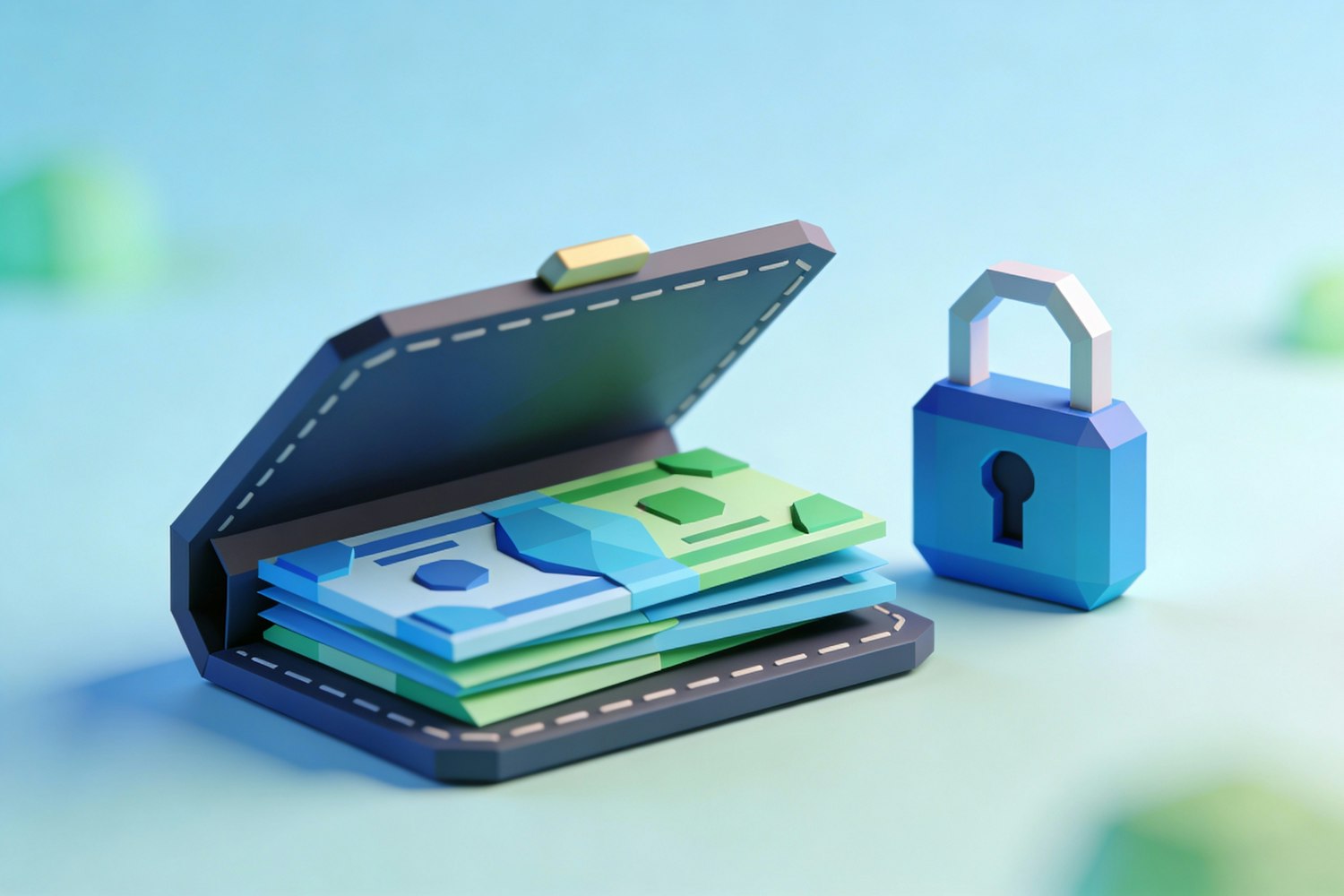 A 3D illustration of a wallet with money and a padlock, symbolizing financial security and modern digital design.