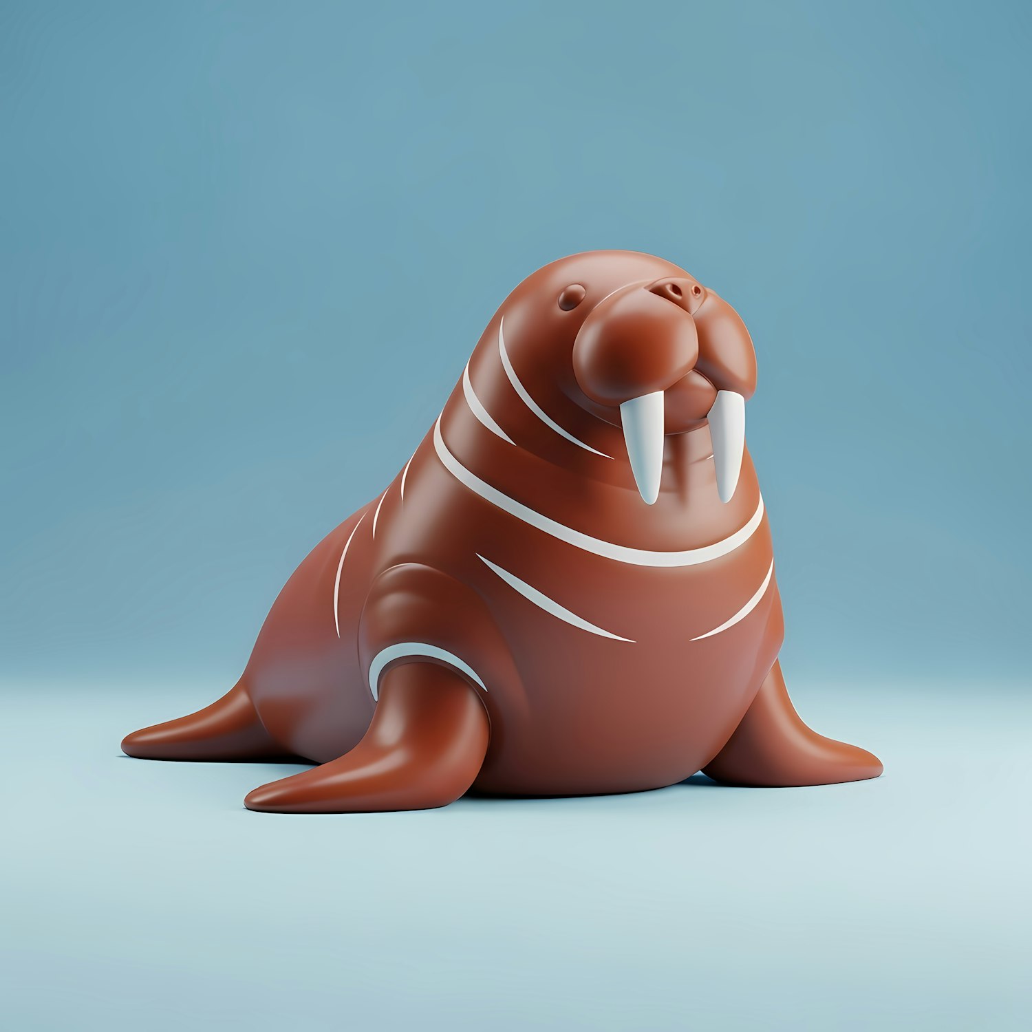 A 3D-rendered cartoon-style walrus with a glossy finish, reddish-brown body, and white tusks, set against a light blue background.