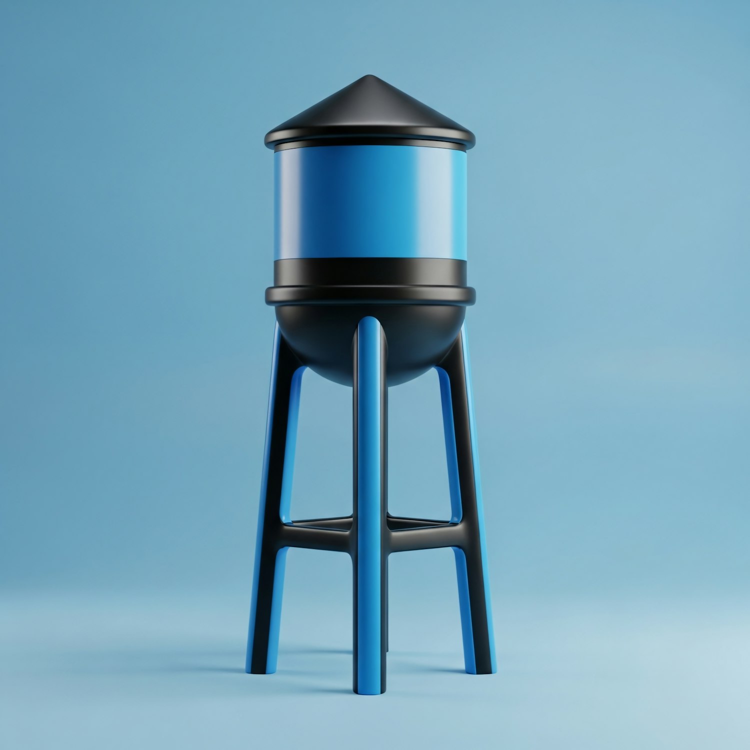 A modern 3D-rendered water tower with a blue tank and black supports, set against a clean blue background.