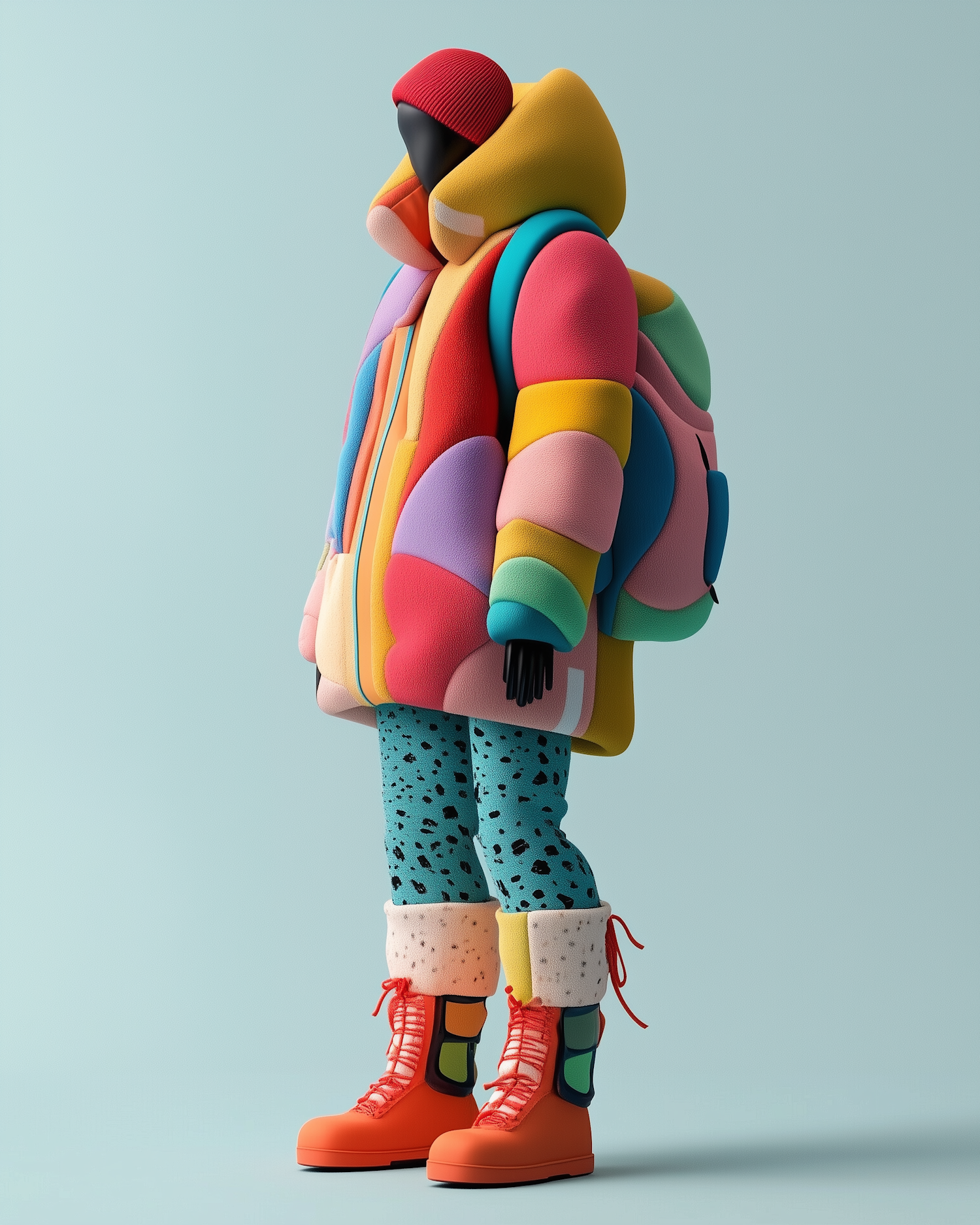 Bold 3D illustration of a mannequin-like figure in colorful winter gear, featuring a patchwork puffer jacket and vibrant accessories.