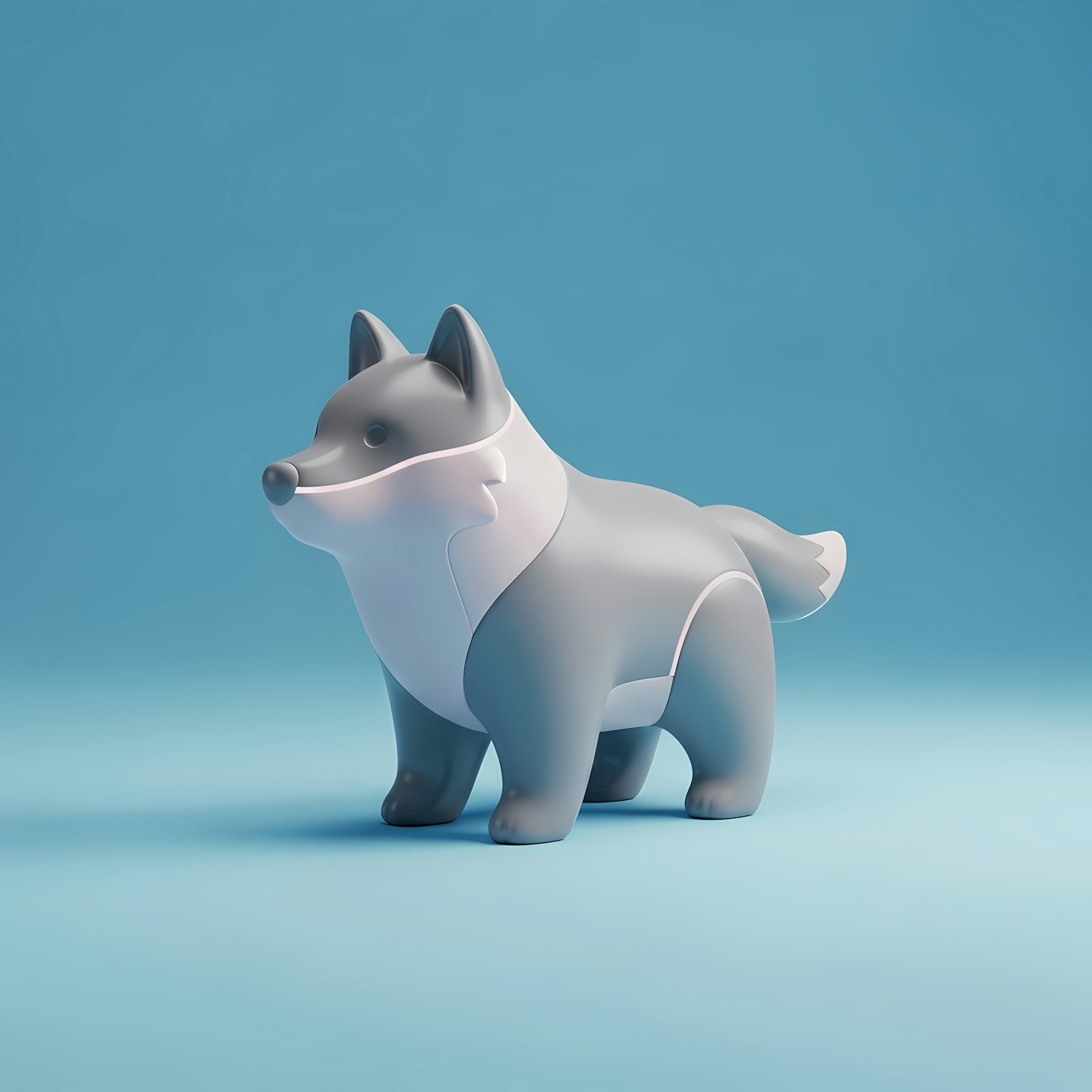 A sleek 3D-rendered wolf figure with a minimalist design, featuring smooth gray and white tones against a clean blue background.