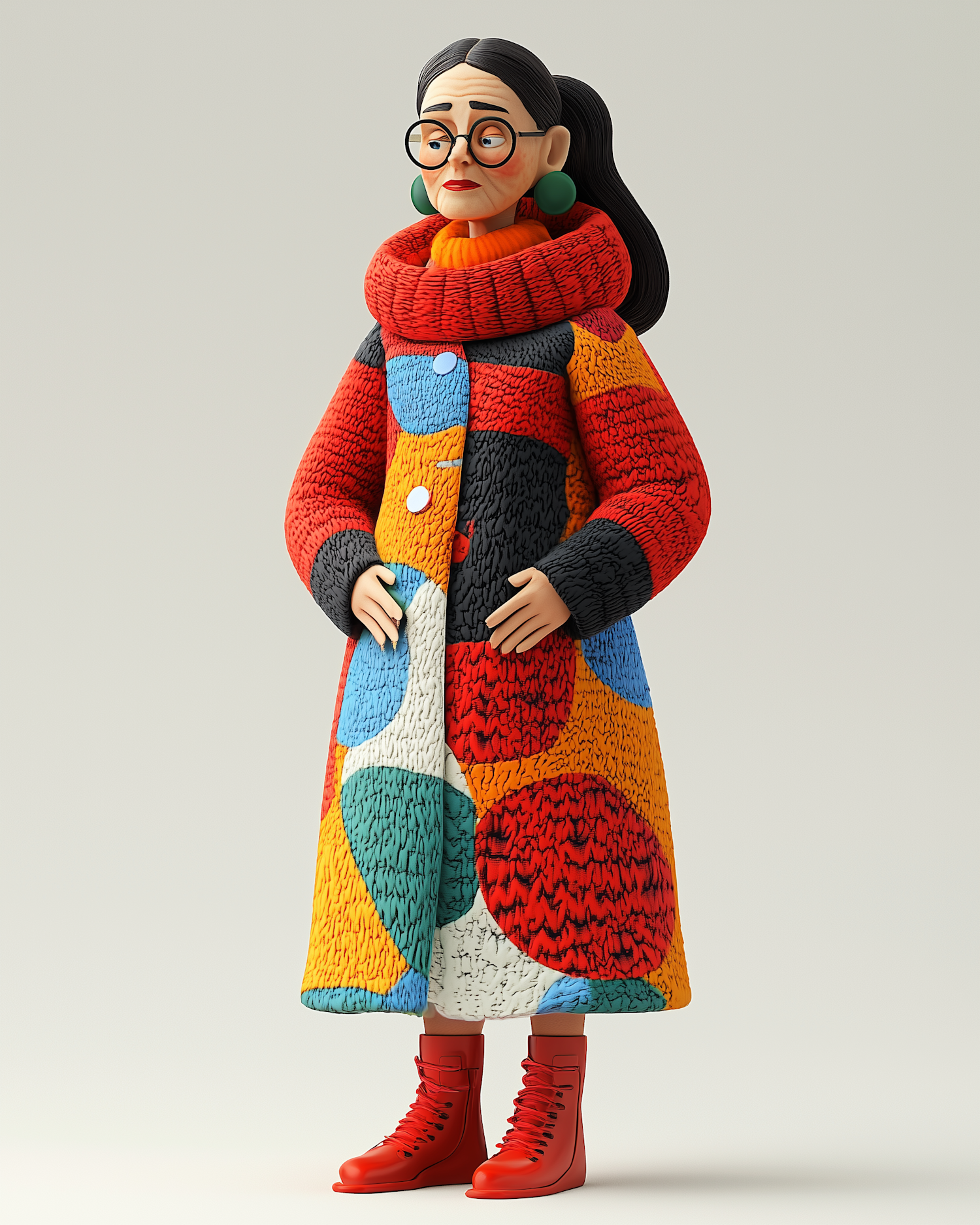 Stylized 3D illustration of a woman in a colorful patchwork coat, red boots, and glasses, with a neutral expression and bold accessories.