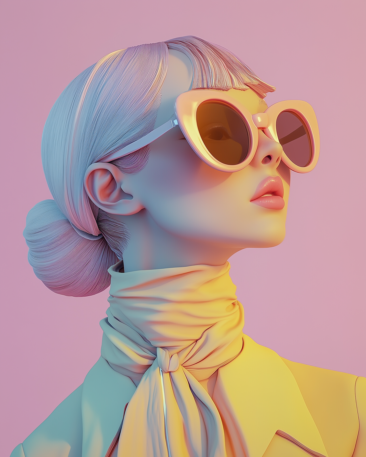 Stylized 3D illustration of a woman in retro sunglasses, yellow scarf, and pastel tones, exuding a chic and modern aesthetic.