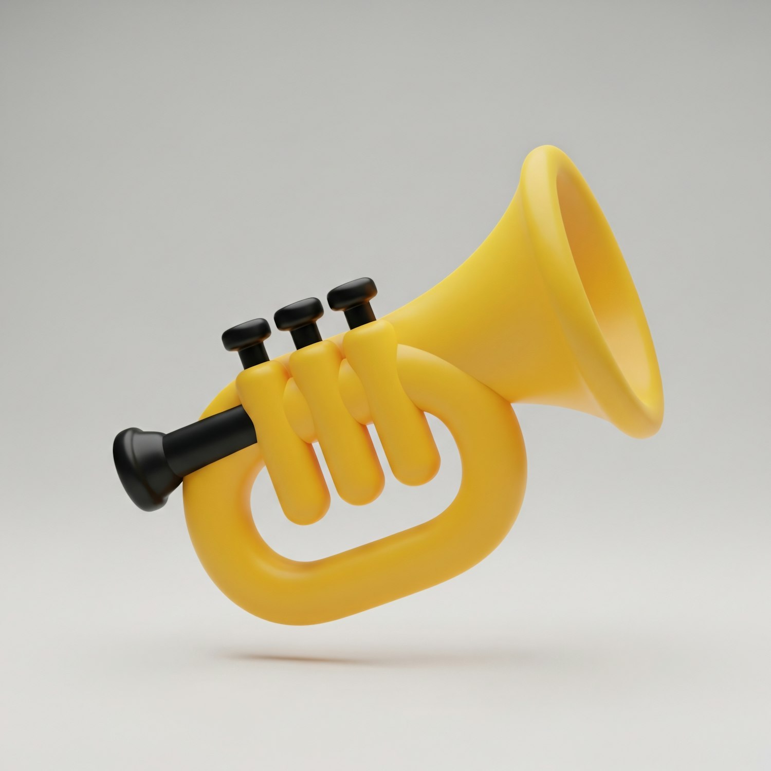 A vibrant 3D-rendered yellow trumpet with black accents, featuring a playful and minimalistic design against a neutral background.
