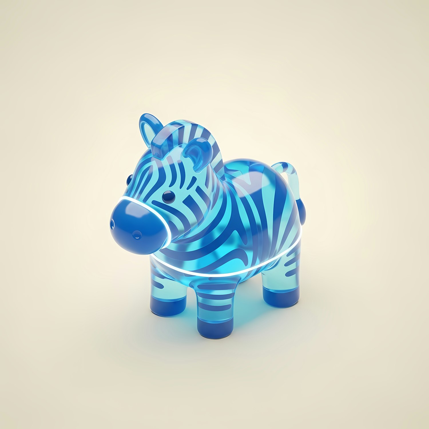 A 3D-rendered translucent blue zebra figurine with a playful design and glossy finish, set against a soft neutral background.