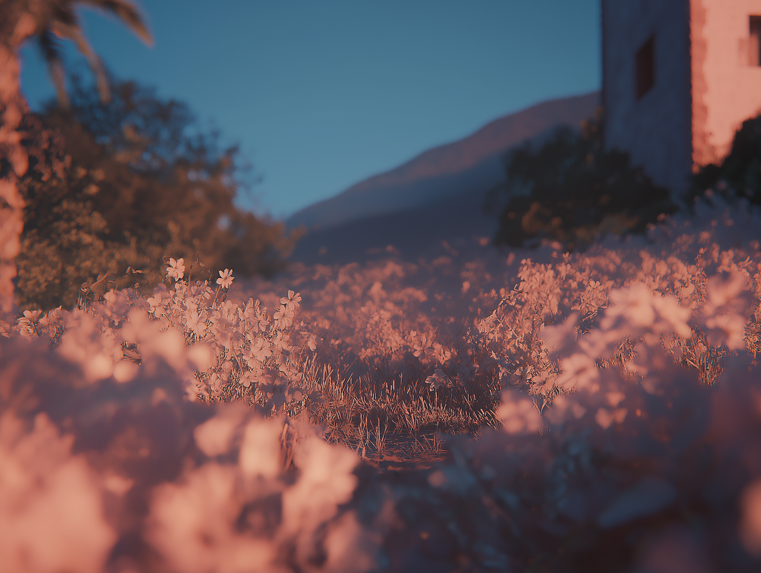 A tranquil field of flowers in warm sunlight, with a distant building and trees under a clear blue sky.