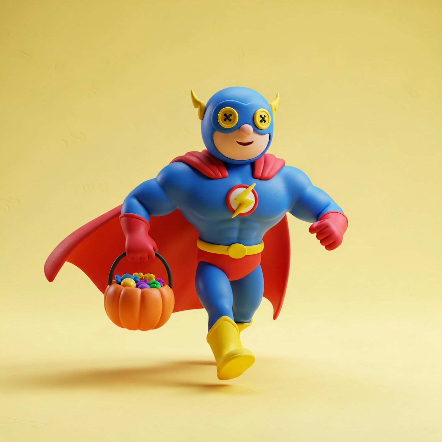 A cartoon superhero in a blue suit and red cape runs with a pumpkin bucket of candy, set against a light yellow background.