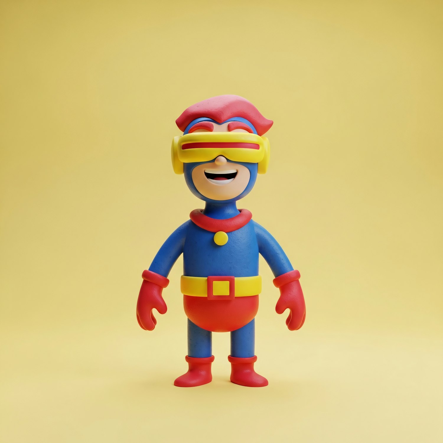 A vibrant cartoon superhero figure in blue, red, and yellow stands against a yellow background, radiating playful energy.