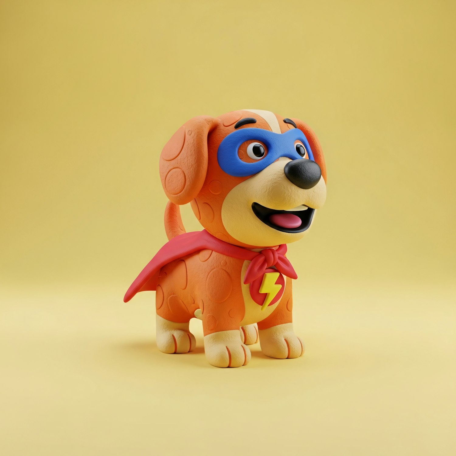 A cheerful 3D cartoon dog in a superhero outfit with a blue mask, red cape, and lightning emblem, set against a bright yellow background.