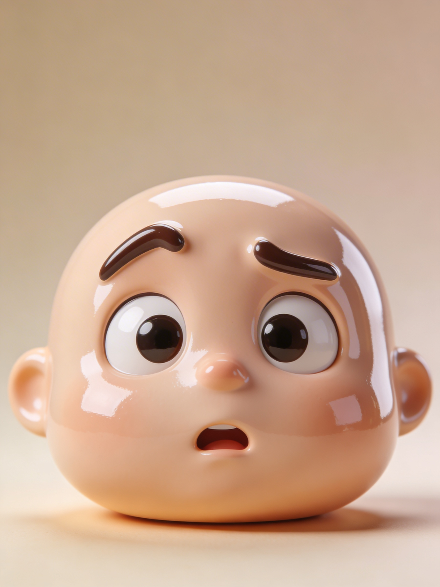 A glossy 3D head with asymmetrical eyebrows and a confused expression, smooth lacquered texture, muted beige background, no text.
