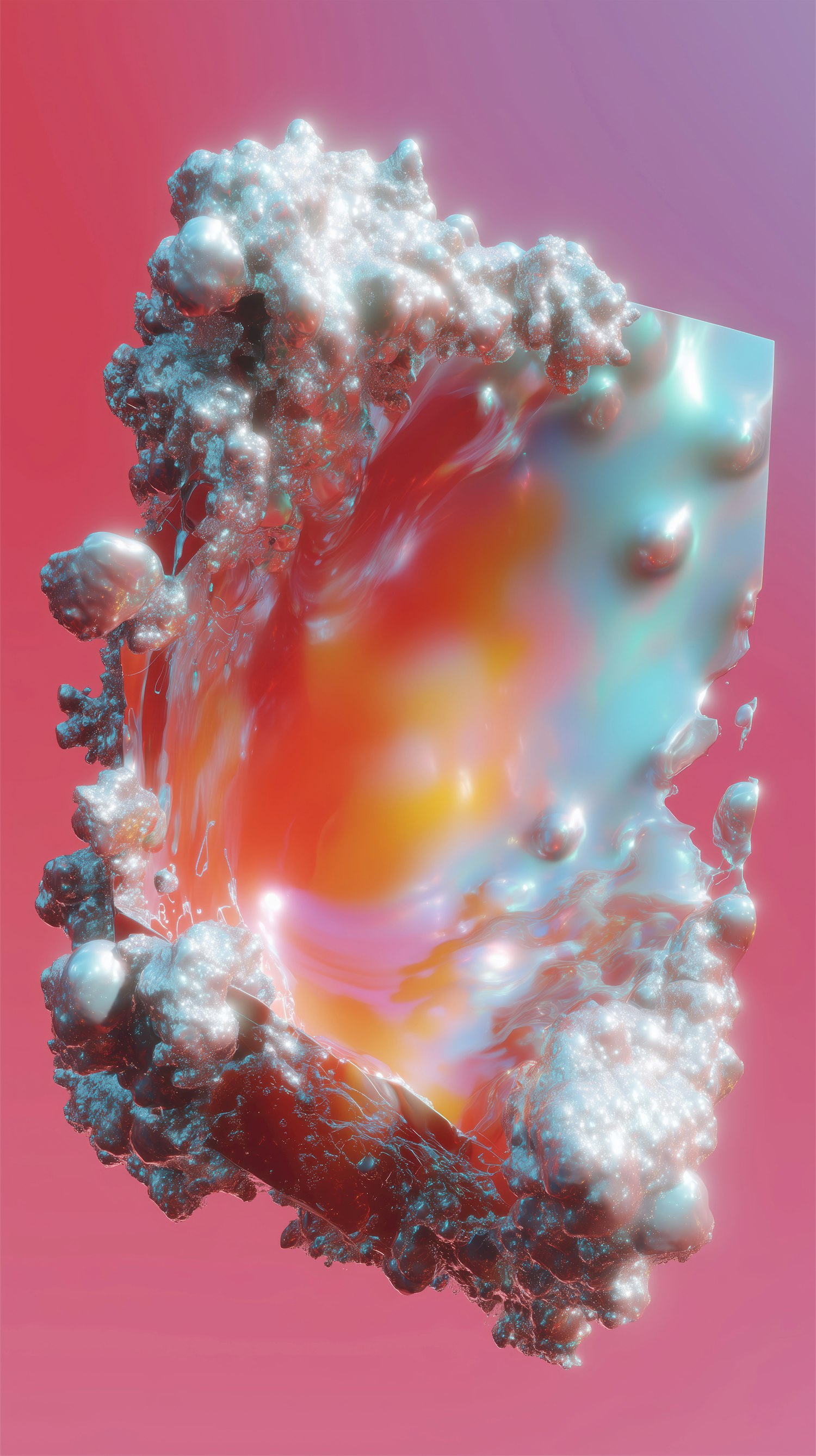 A vibrant 3D abstract artwork with iridescent textures, pearl-like bubbles, and a dreamy pink-to-purple gradient background.