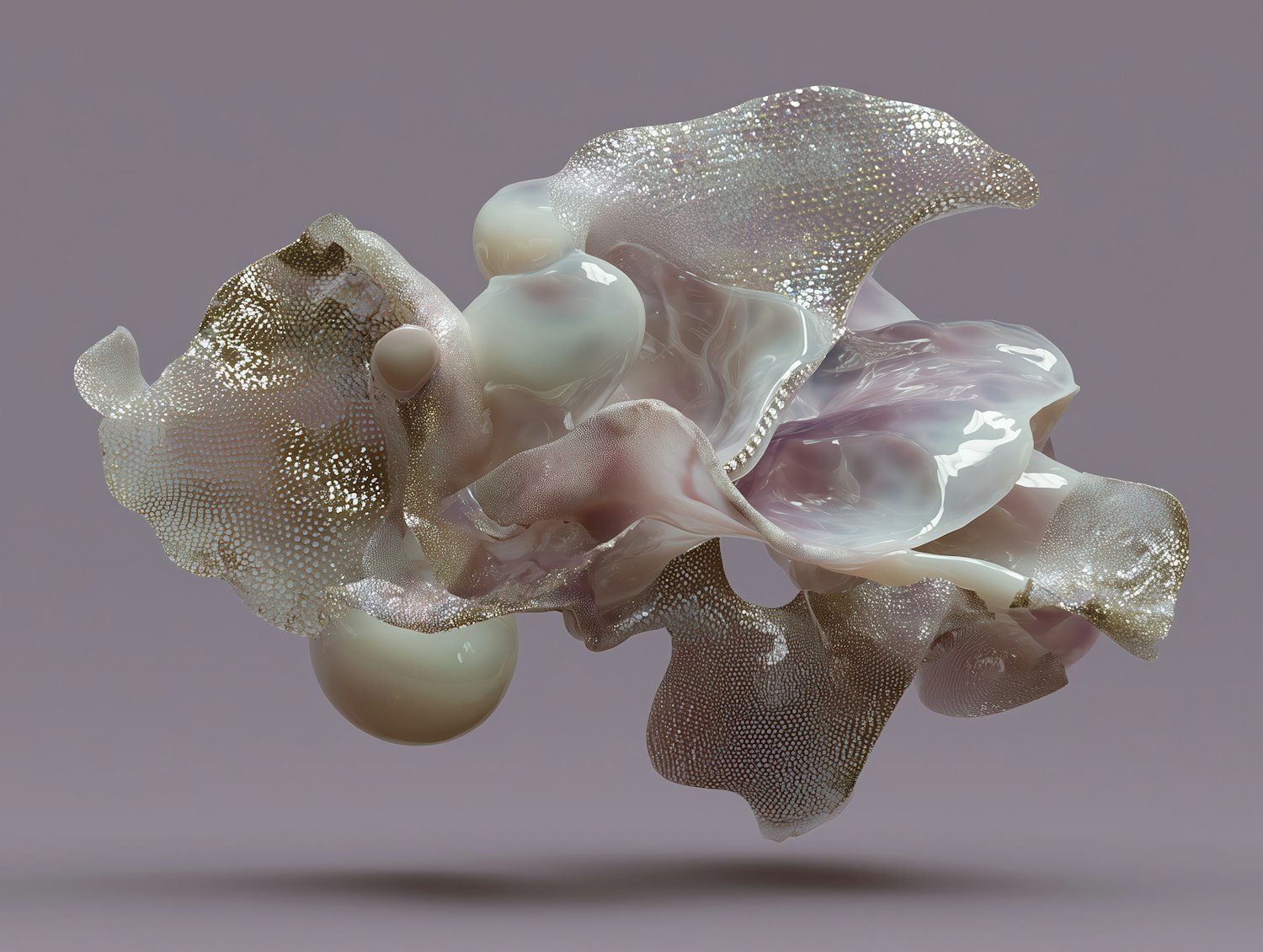 A stunning 3D abstract design with flowing, translucent textures and metallic accents, set against a soft lavender background.