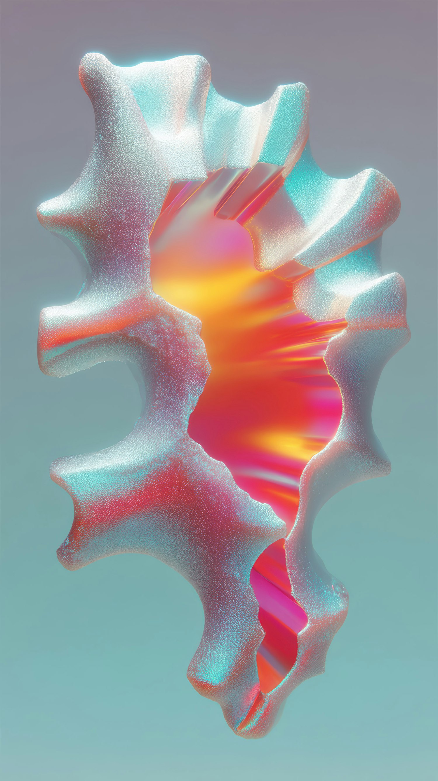 Abstract 3D art of a frosted, coral-like structure with glowing warm hues inside, set against a muted teal background.