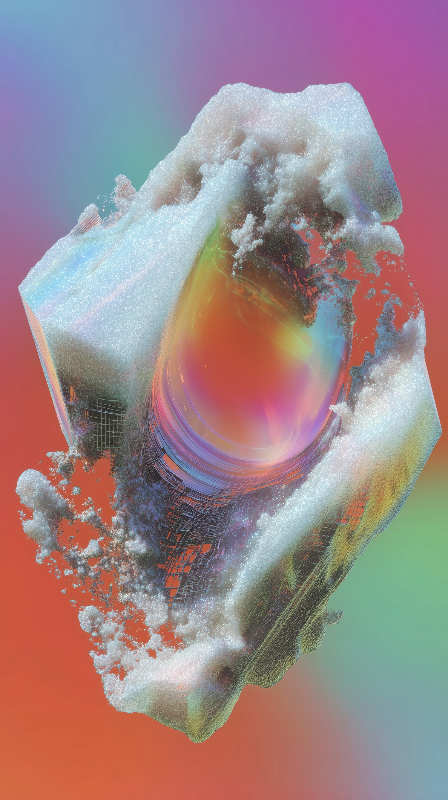 Abstract 3D art of a glowing crystalline structure with iridescent hues and a cloud-like texture, set against a pastel gradient background.