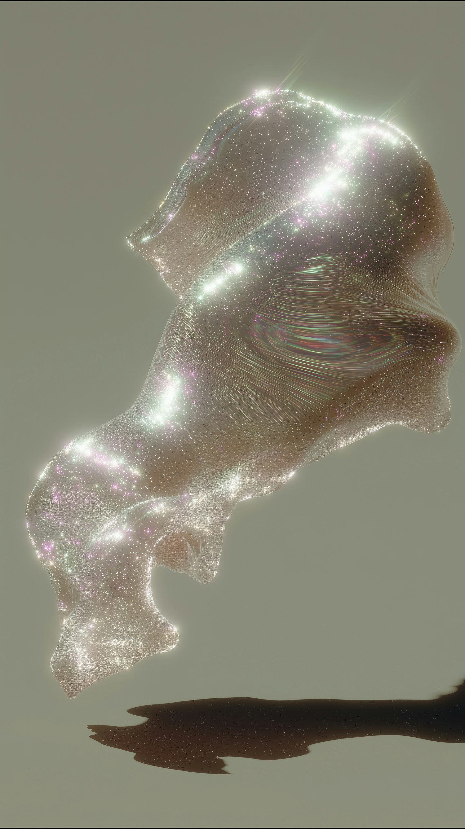 A glowing, iridescent abstract form with star-like specks floats against a muted beige background, casting a dark shadow below.
