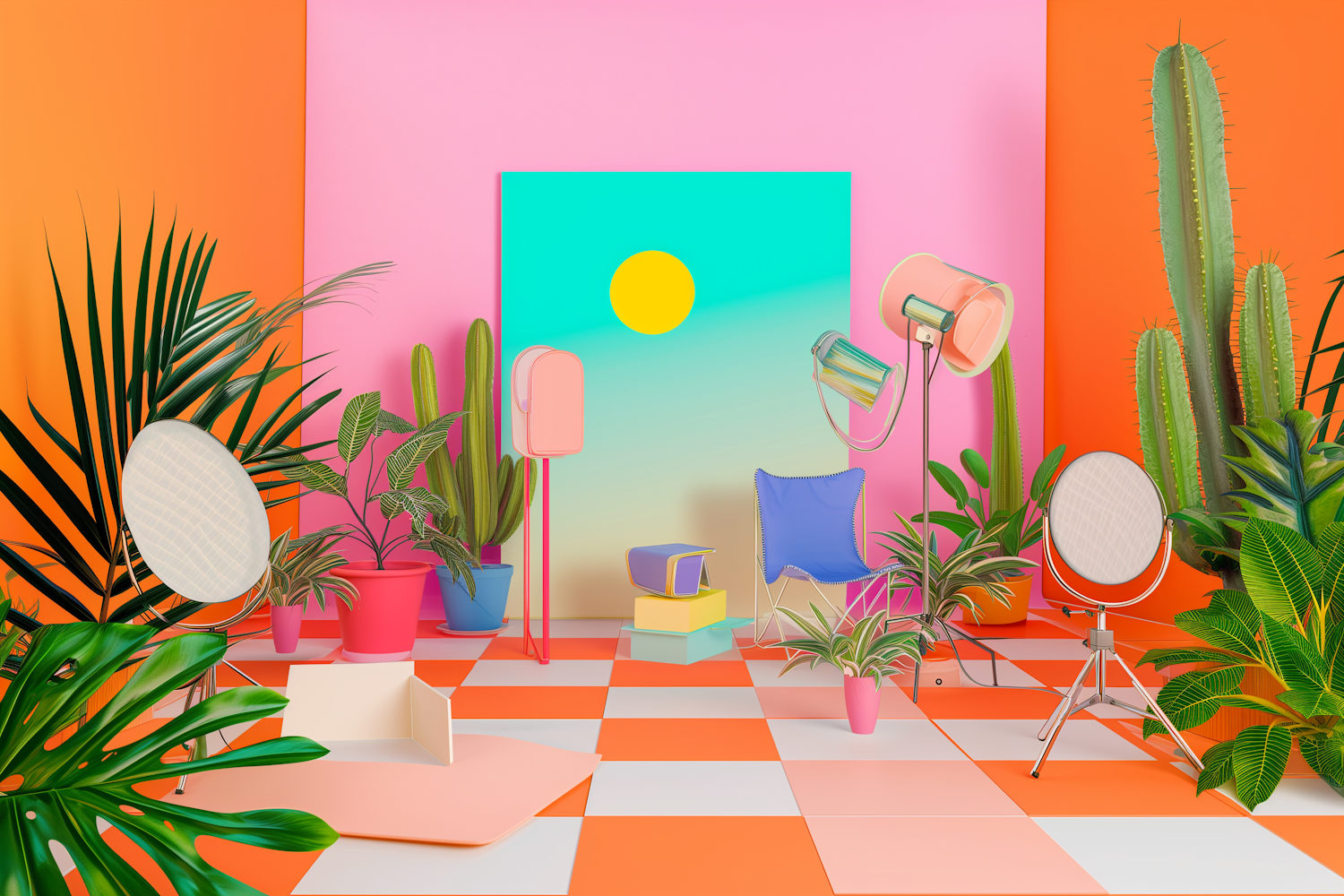 Vibrant room with colorful walls, abstract furniture, and lush plants. A modern artistic space with a playful, lively vibe.