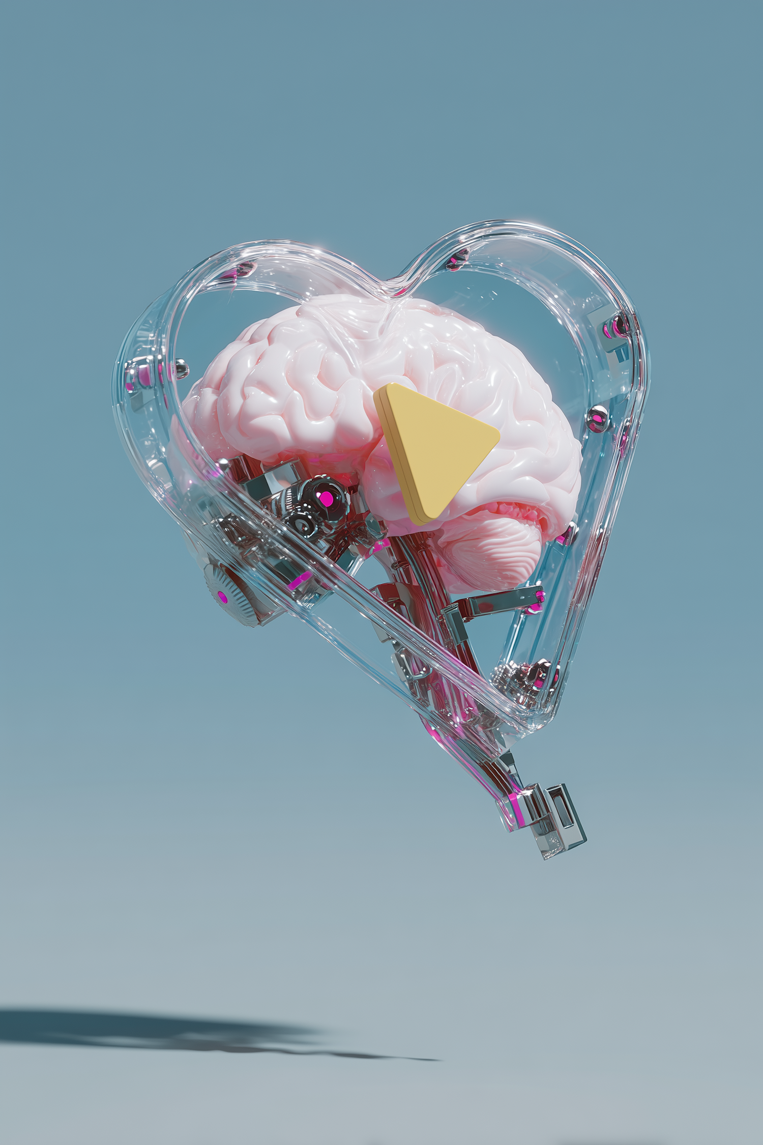 A 3D-rendered brain encased in a transparent heart-shaped structure with mechanical elements, set against a light blue background.