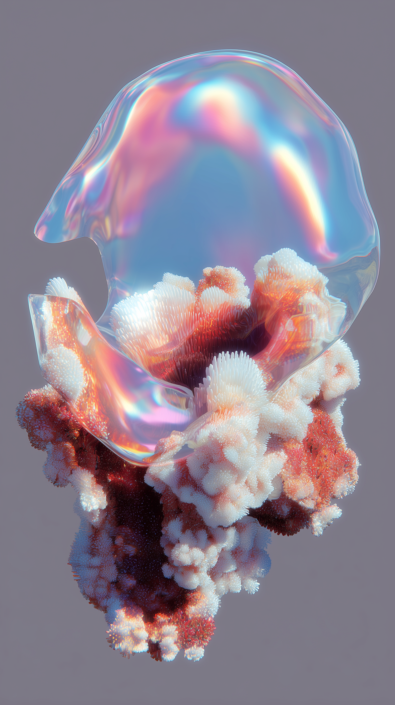 A stunning 3D artwork of an iridescent shell-like structure surrounding vibrant coral formations, set against a neutral background.