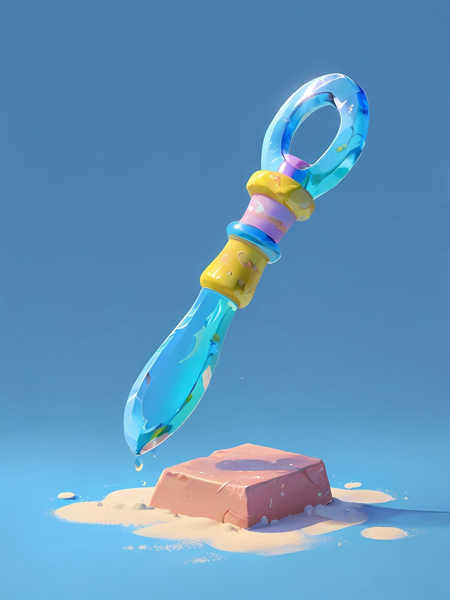 A colorful glass-like dropper dripping liquid onto a melting pink block on a bright blue background. Whimsical and surreal design.