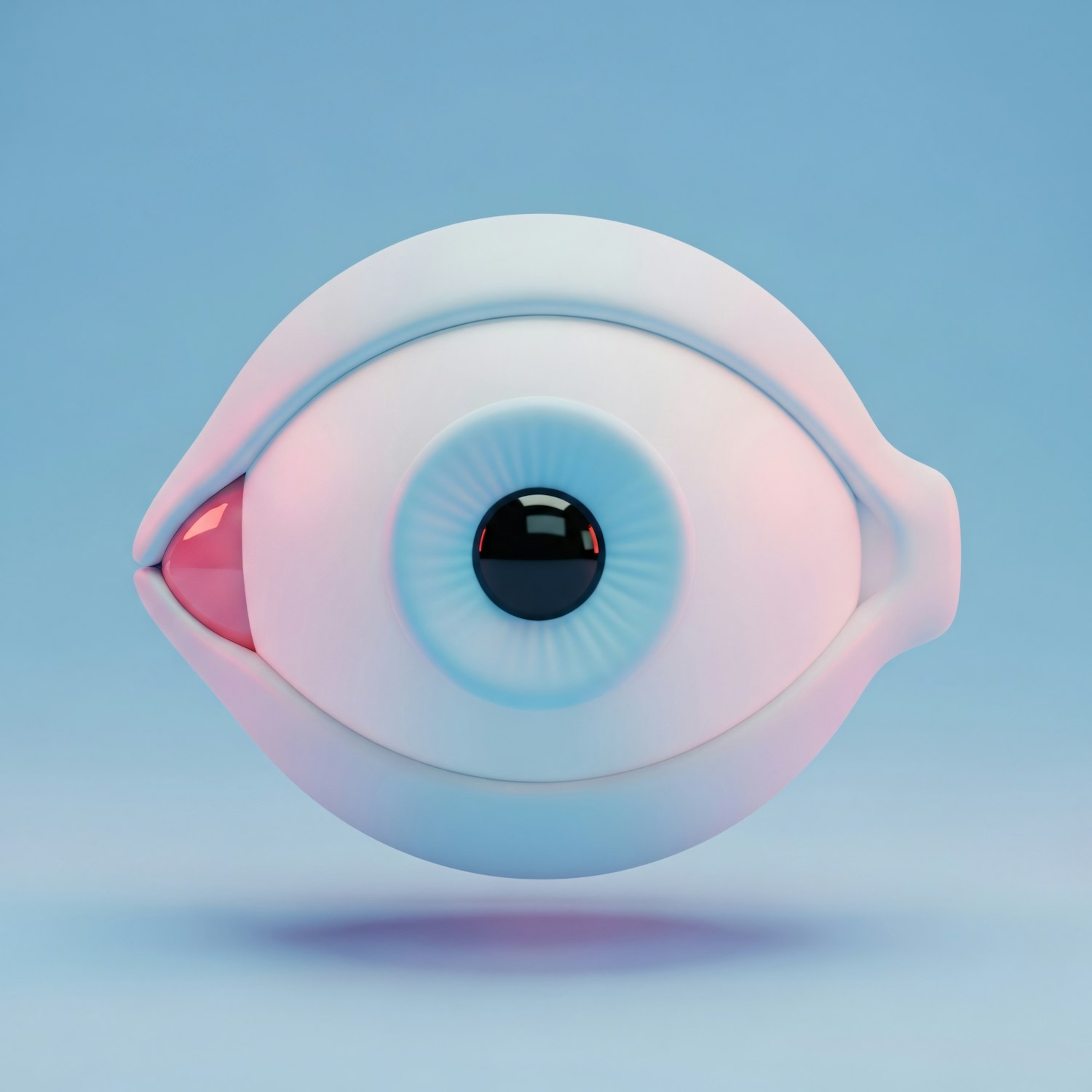 A surreal 3D rendering of an eye-like object with a glossy black pupil and blue iris, set against a gradient blue background.