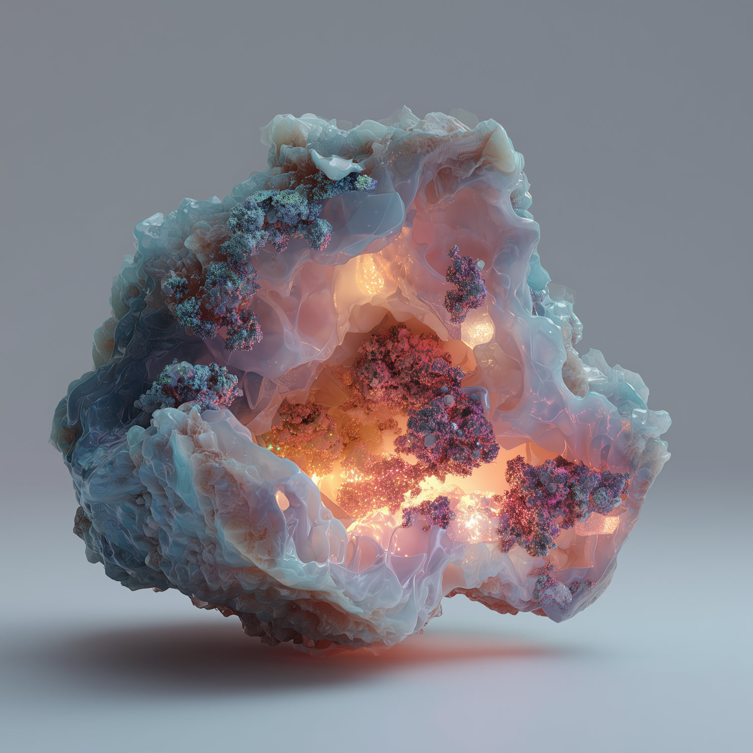 A stunning 3D-rendered geode-like structure with glowing lights and intricate coral-like textures in pastel hues.