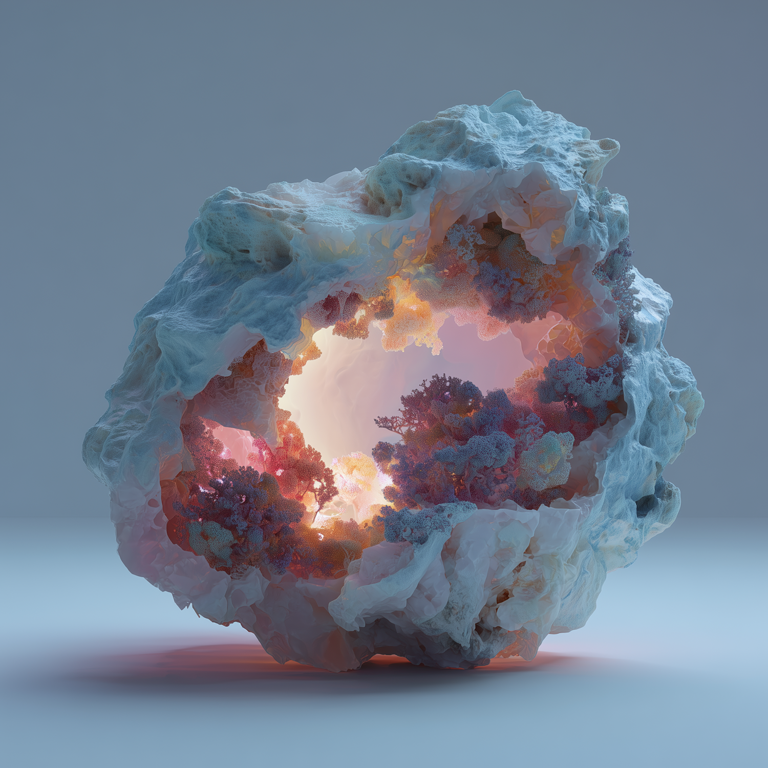 A stunning 3D-rendered geode-like structure with glowing coral-like formations inside, radiating warm hues against a cool background.
