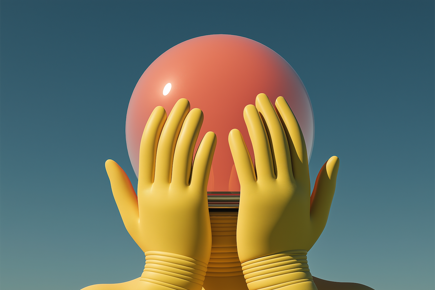 A surreal digital artwork of yellow gloves covering a glossy orange sphere against a teal background, creating a minimalist and futuristic vibe.