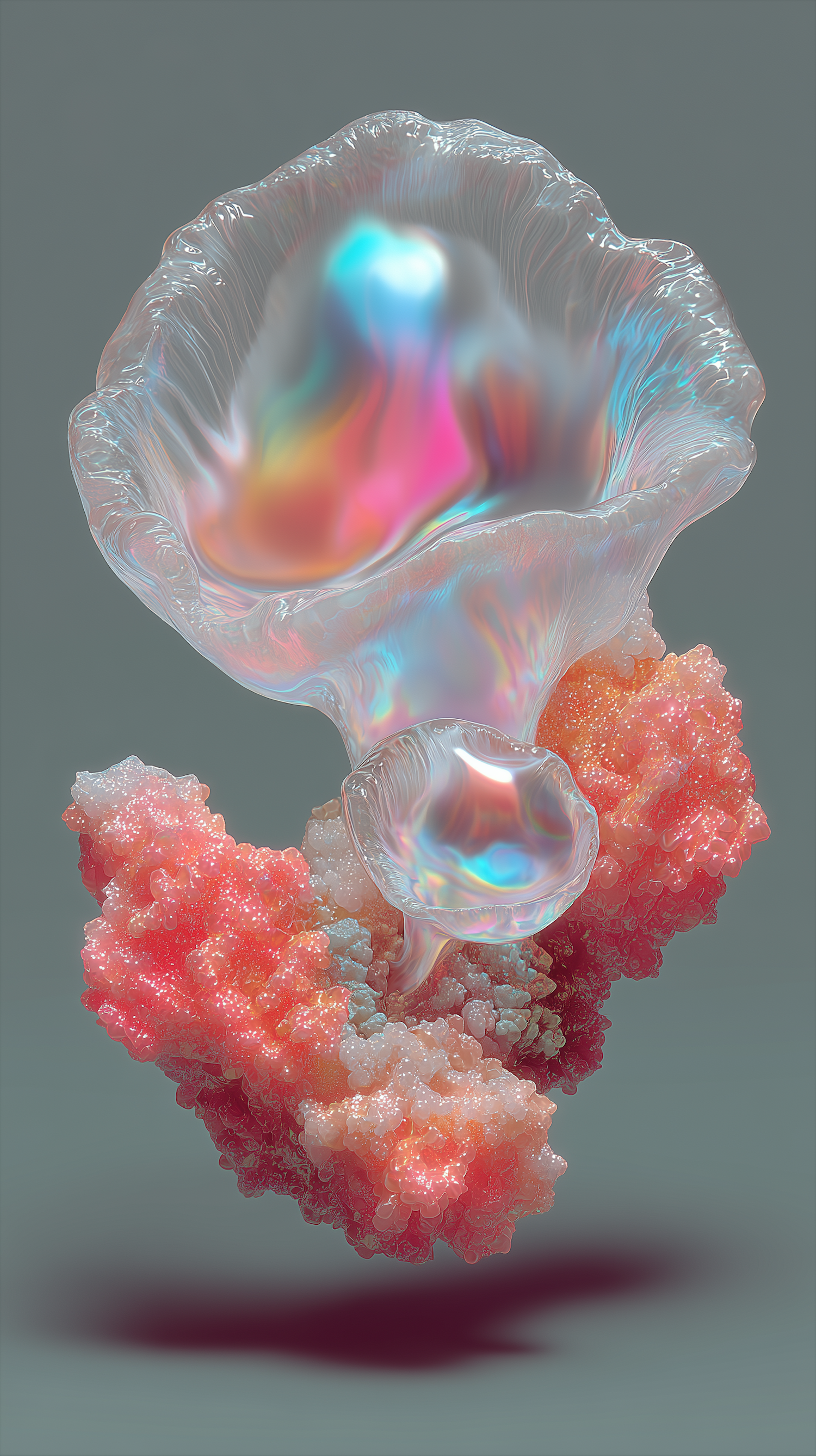 A stunning 3D artwork of a translucent, iridescent organic form above a textured coral-like base, set against a neutral background.