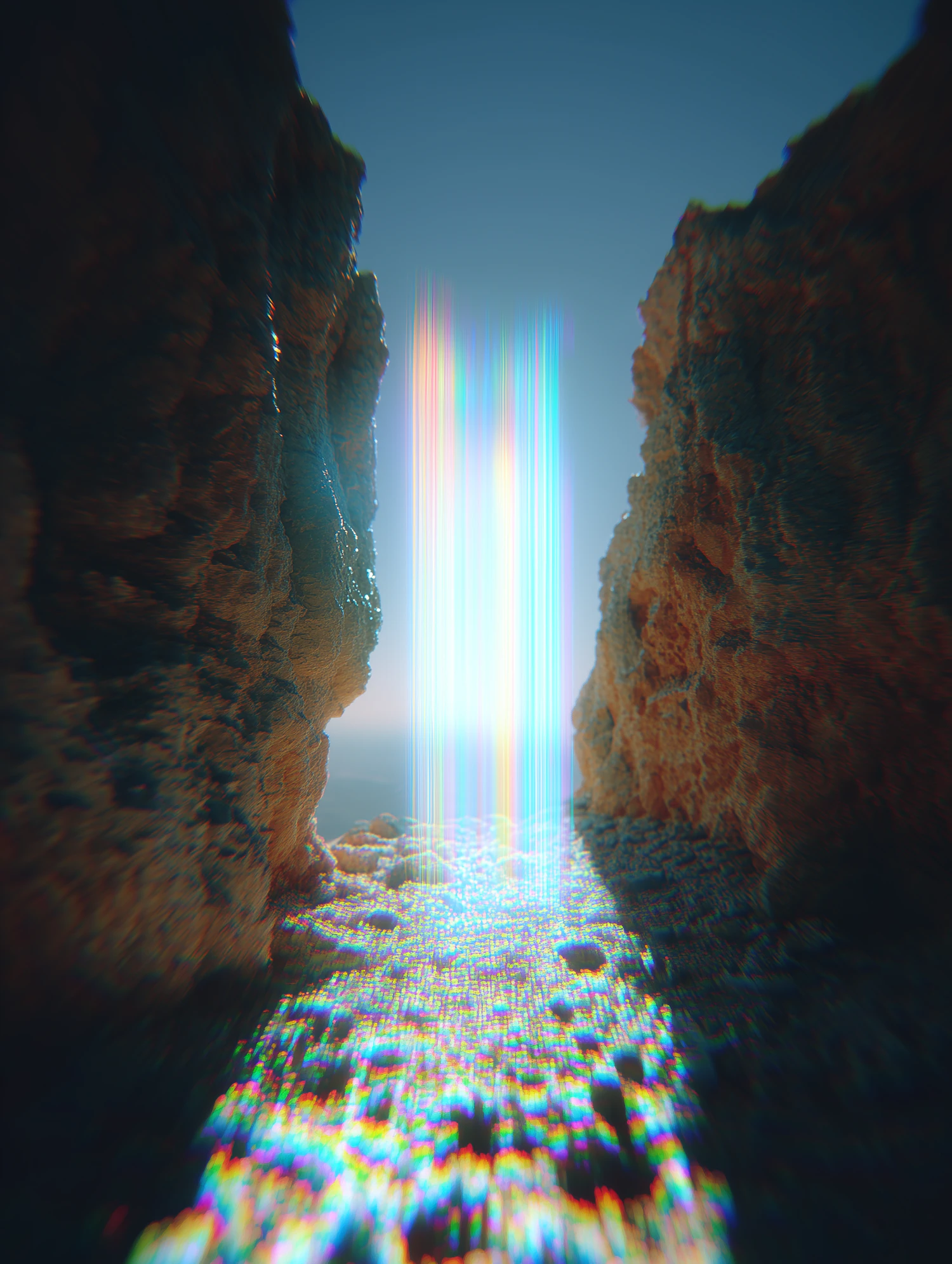 A surreal rocky passage illuminated by a vibrant, multicolored light beam, creating a striking contrast with the natural textures.