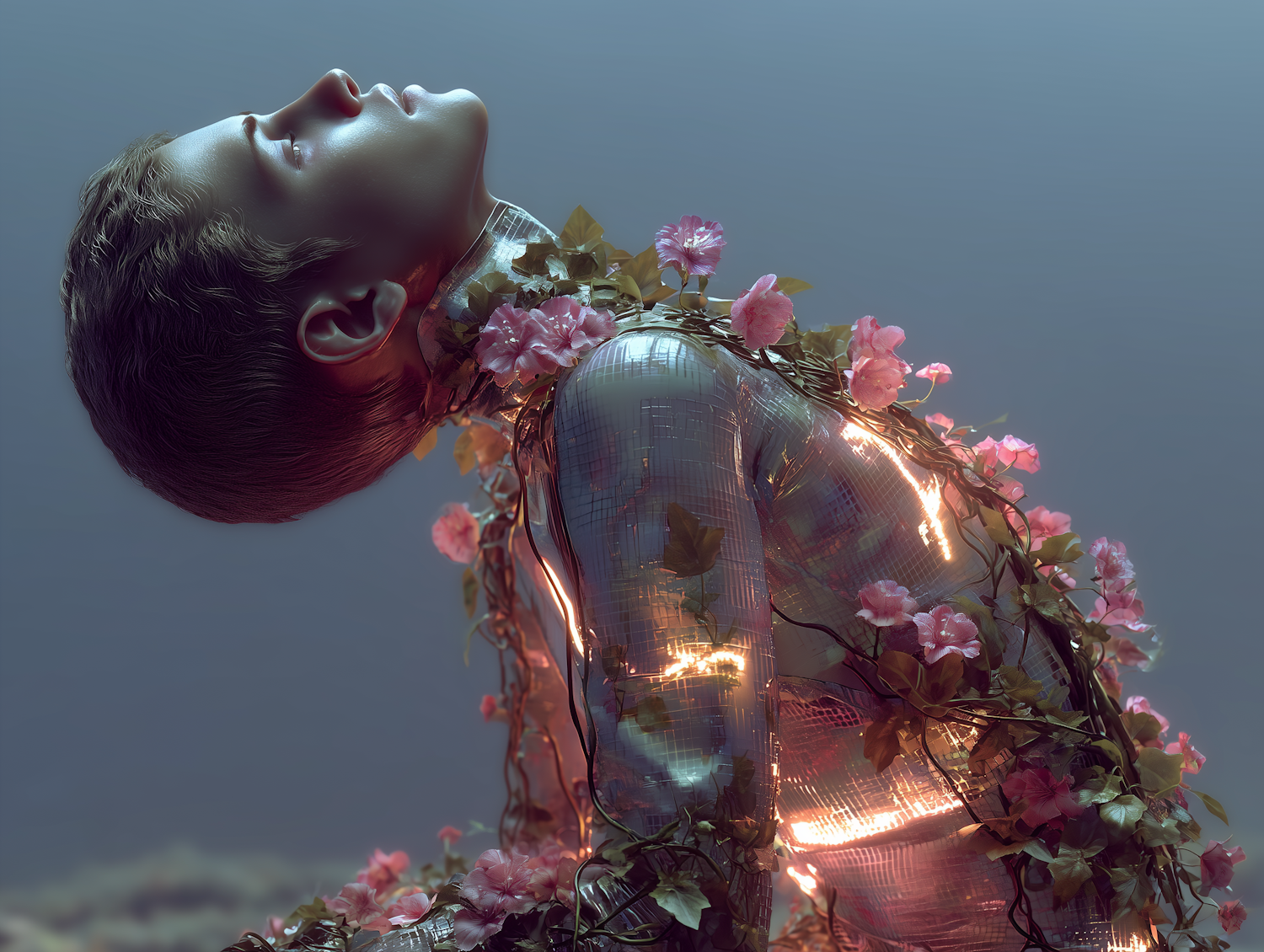 A surreal metallic figure adorned with glowing lights and pink flowers, creating a blend of organic and artificial beauty.