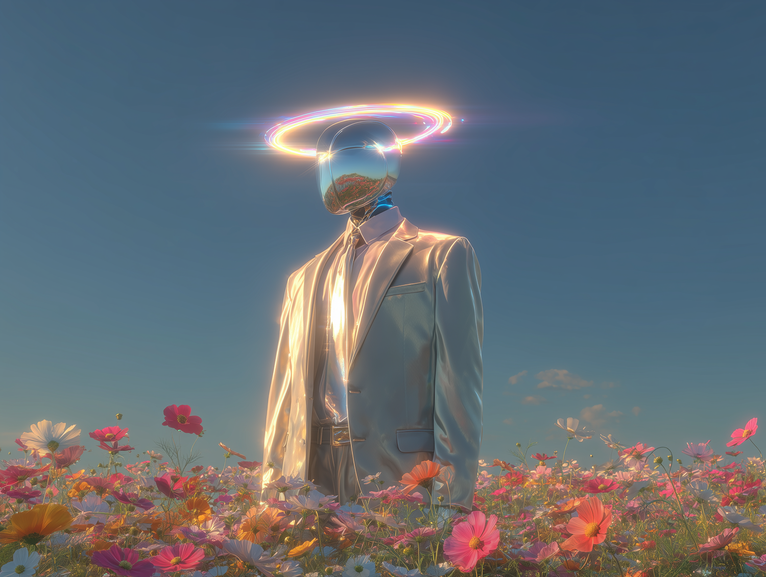 A surreal humanoid figure with a metallic head and glowing halo stands in a vibrant flower field under a clear sky.