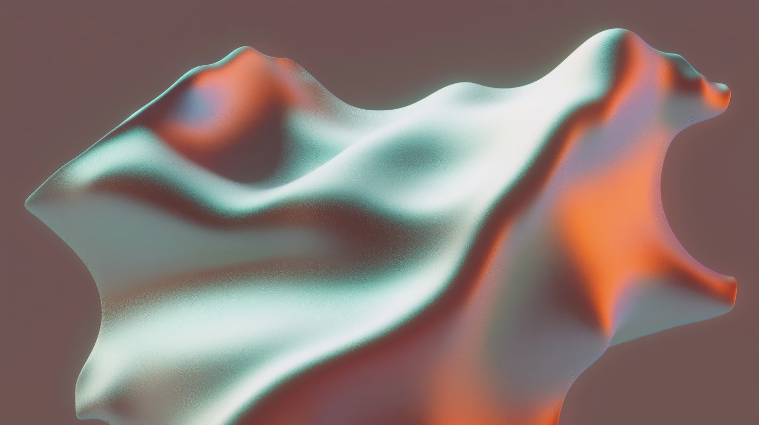 Abstract 3D shape with metallic teal, orange, and purple hues, resembling flowing fabric or liquid, set against a muted background.