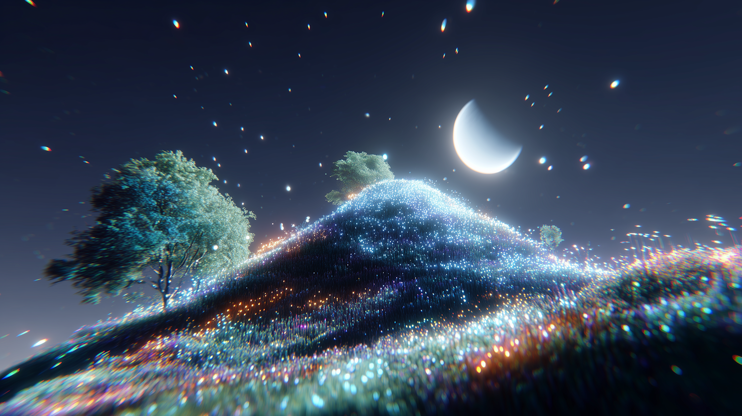 A glowing hill under a crescent moon with bioluminescent grass and illuminated trees, creating a serene and surreal nighttime scene.