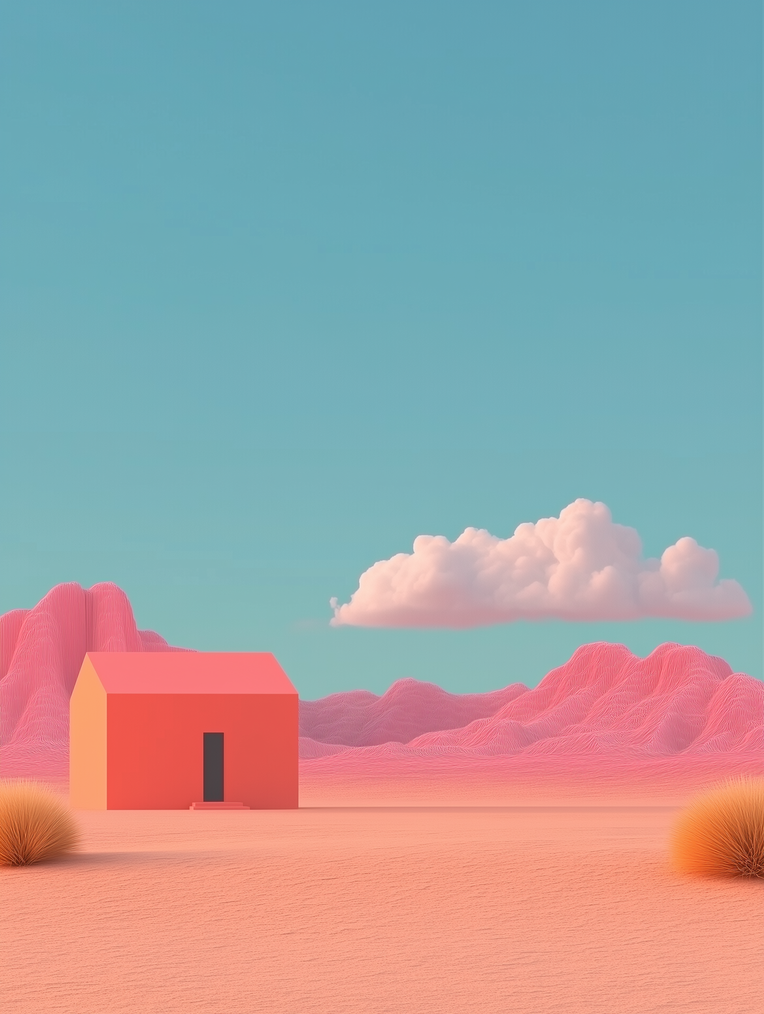 Surreal pink desert landscape with a minimalist house, rolling hills, and a fluffy cloud under a bright blue sky.