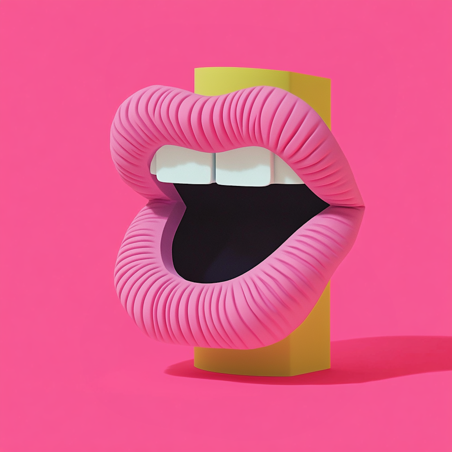 Bright pink 3D lips with white teeth on a yellow block, set against a vivid pink background. A bold and playful pop-art style design.