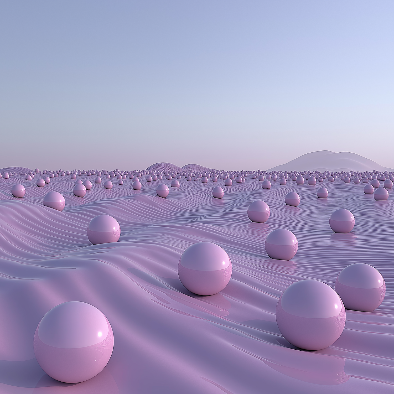 Surreal landscape with glossy pink spheres on a wavy surface under a soft blue and purple sky.