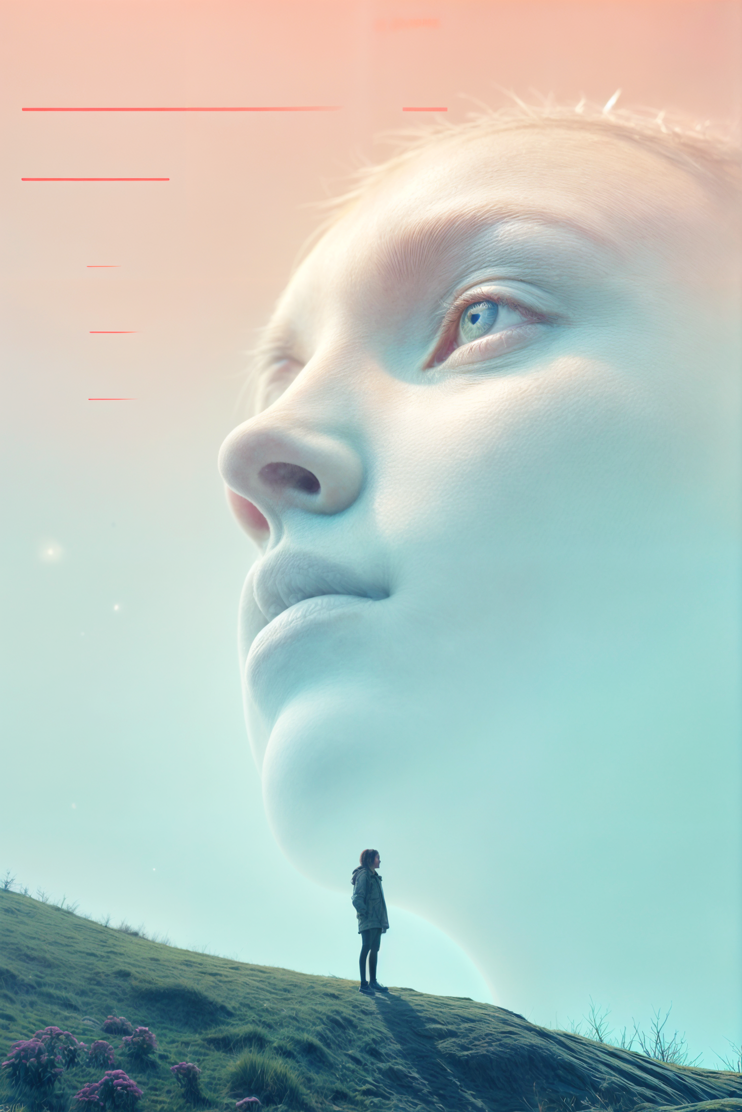 Surreal scene with a giant ethereal face in the sky and a small figure on a grassy hill, creating a dreamlike atmosphere.