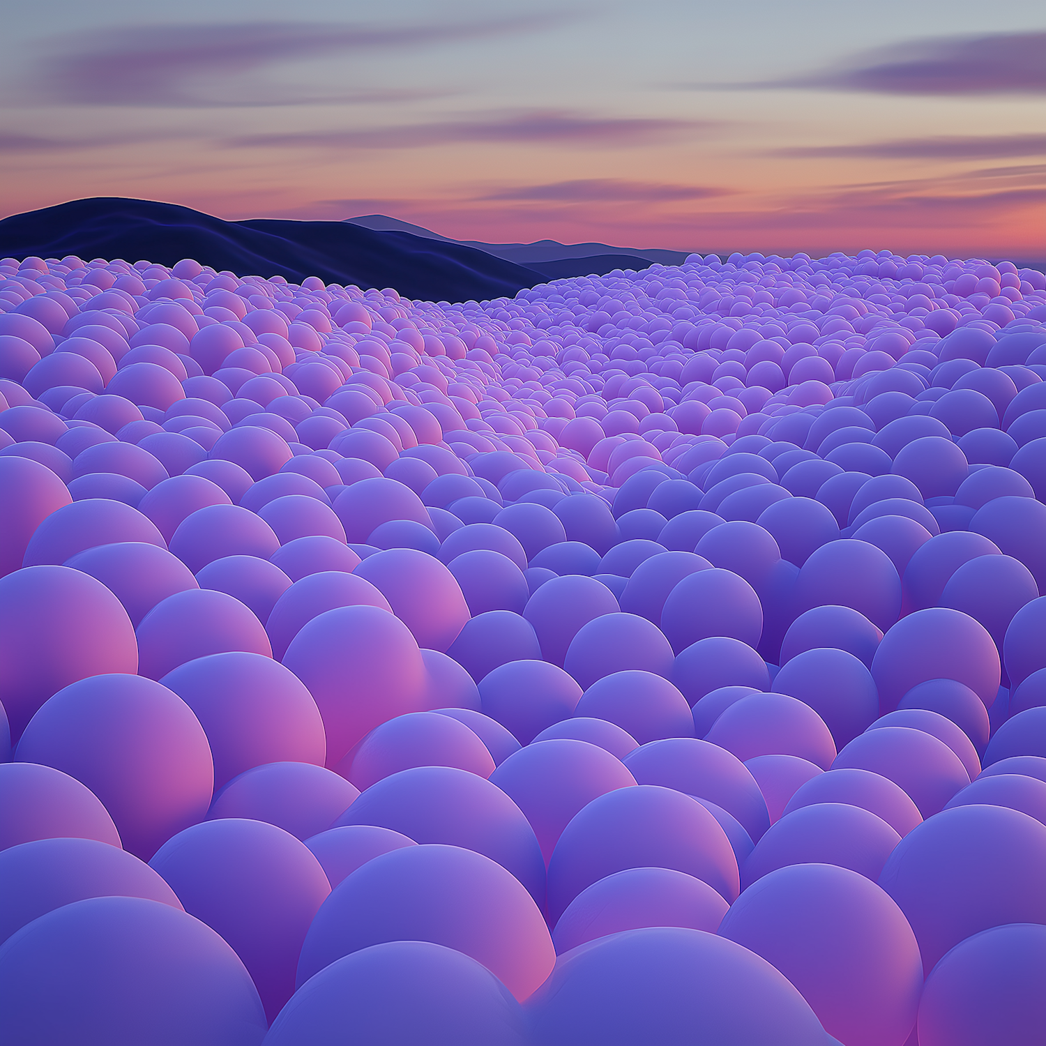 A surreal landscape of purple and pink spheres under a vibrant sunset sky, blending fantasy and tranquility.