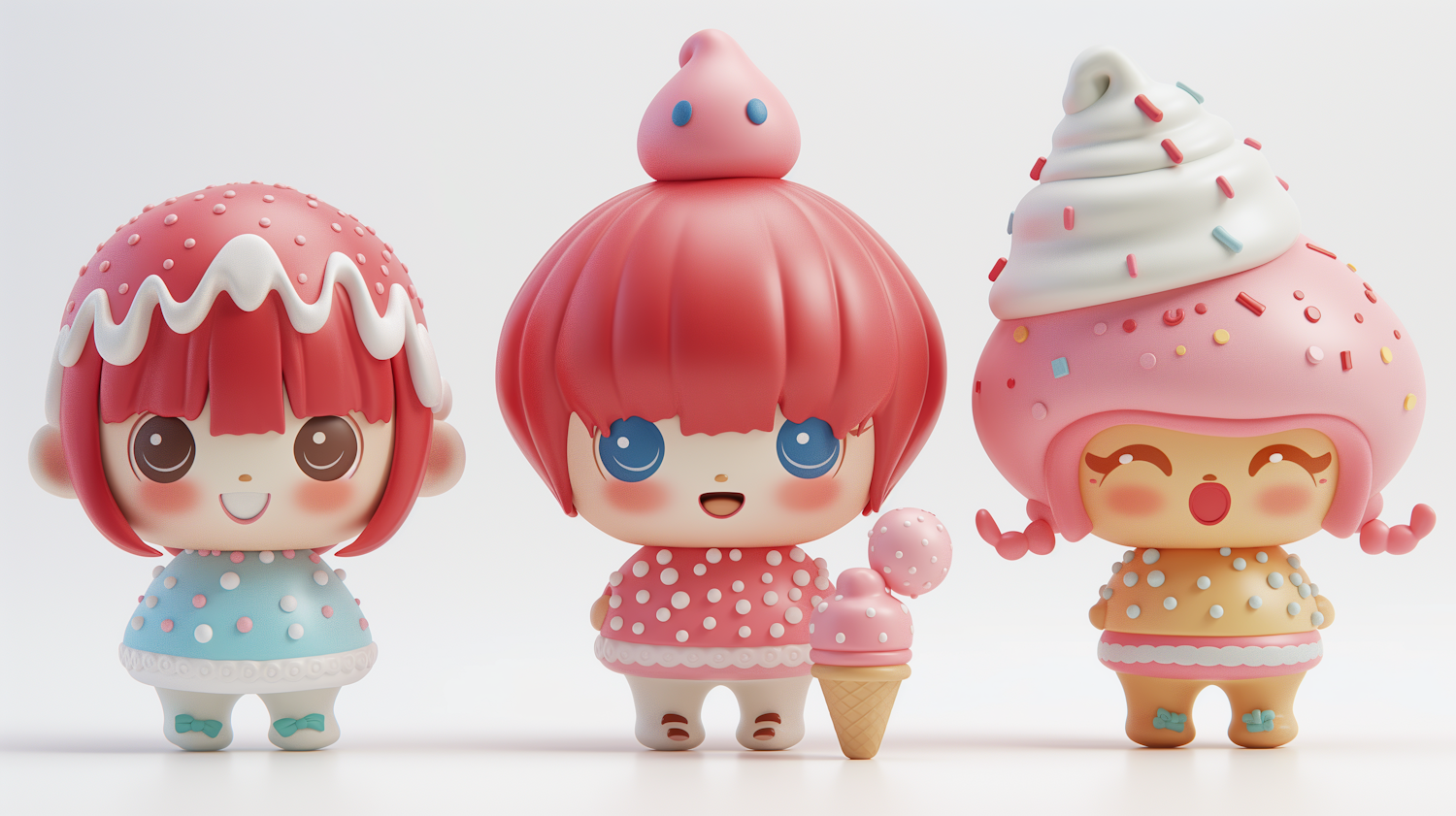 Cute dessert-themed cartoon characters with ice cream and cupcake designs, featuring vibrant colors and playful expressions.