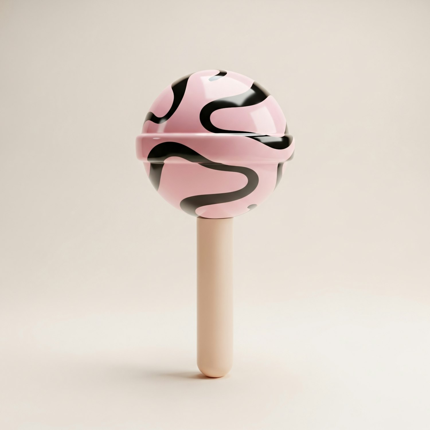 A 3D-rendered lollipop with a pink and black swirl design, standing upright on a neutral background.
