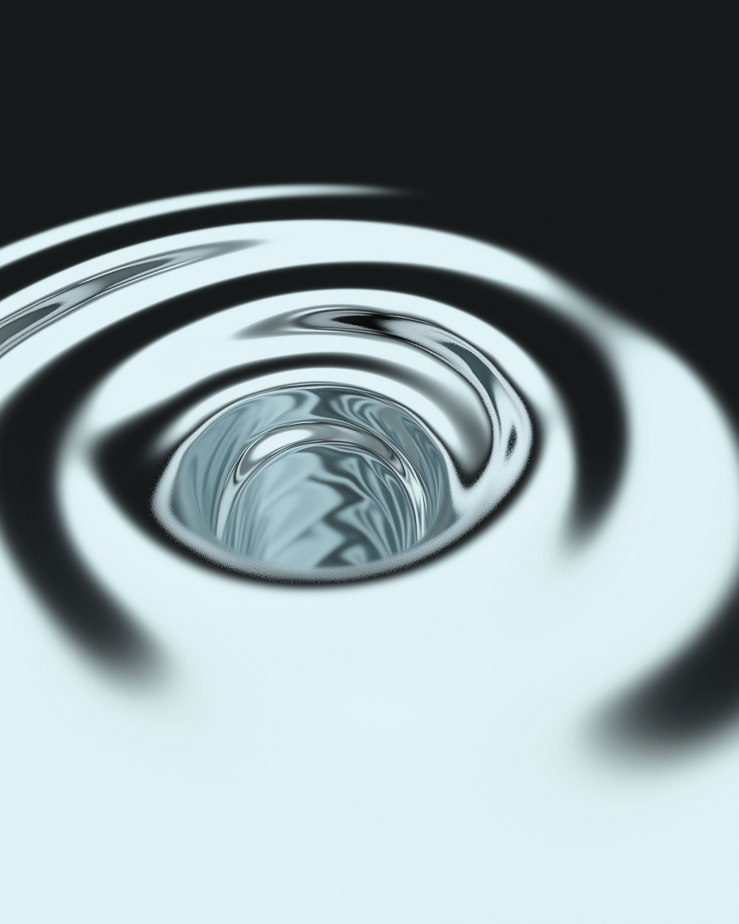 Abstract digital art of a metallic spiral vortex with light blue and white tones, set against a dark background for dramatic contrast.