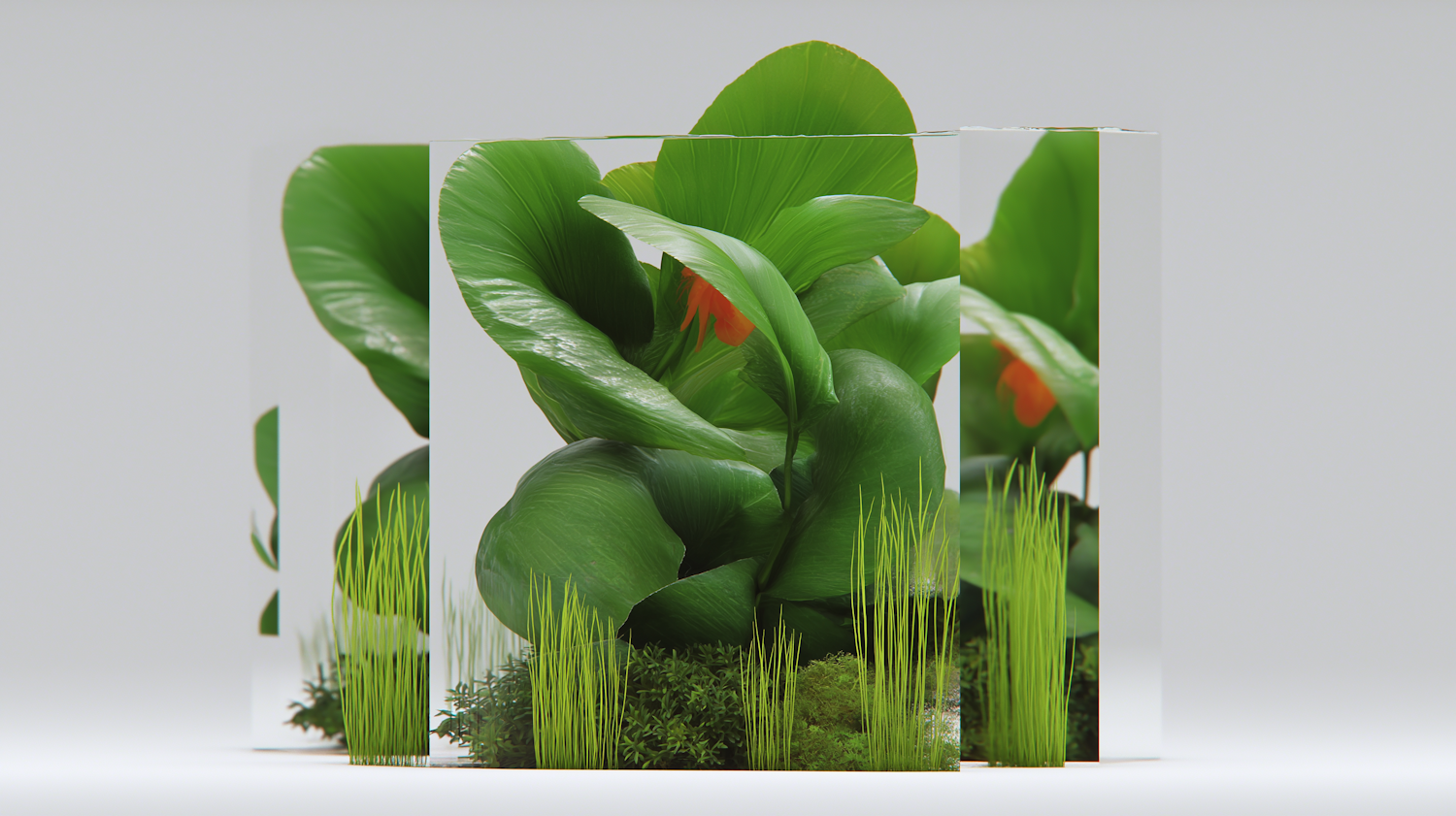 A modern artistic display of lush green plants with orange flowers, mirrored for a symmetrical effect against a white background.
