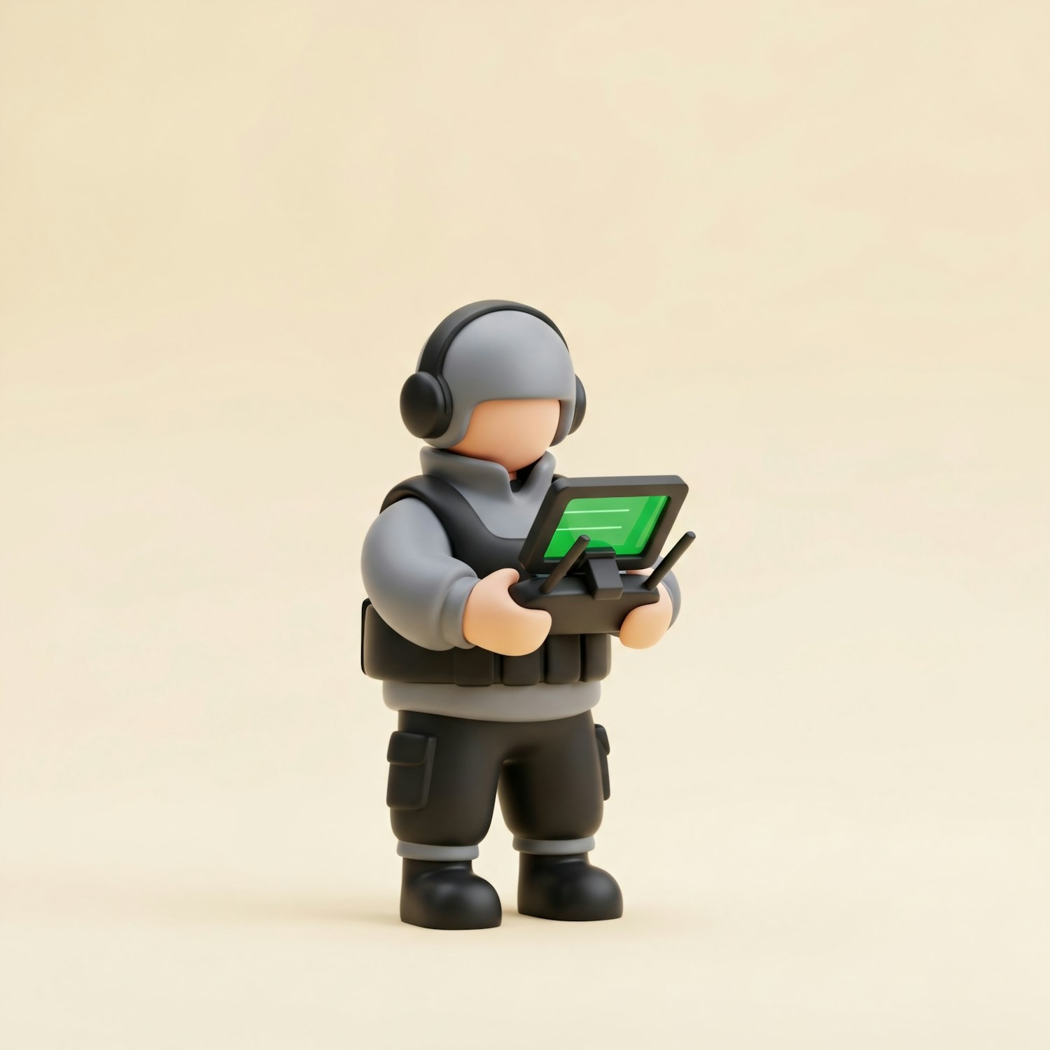 A 3D illustration of a tactical operator holding a device, featuring a minimalistic and cartoonish design on a beige background.