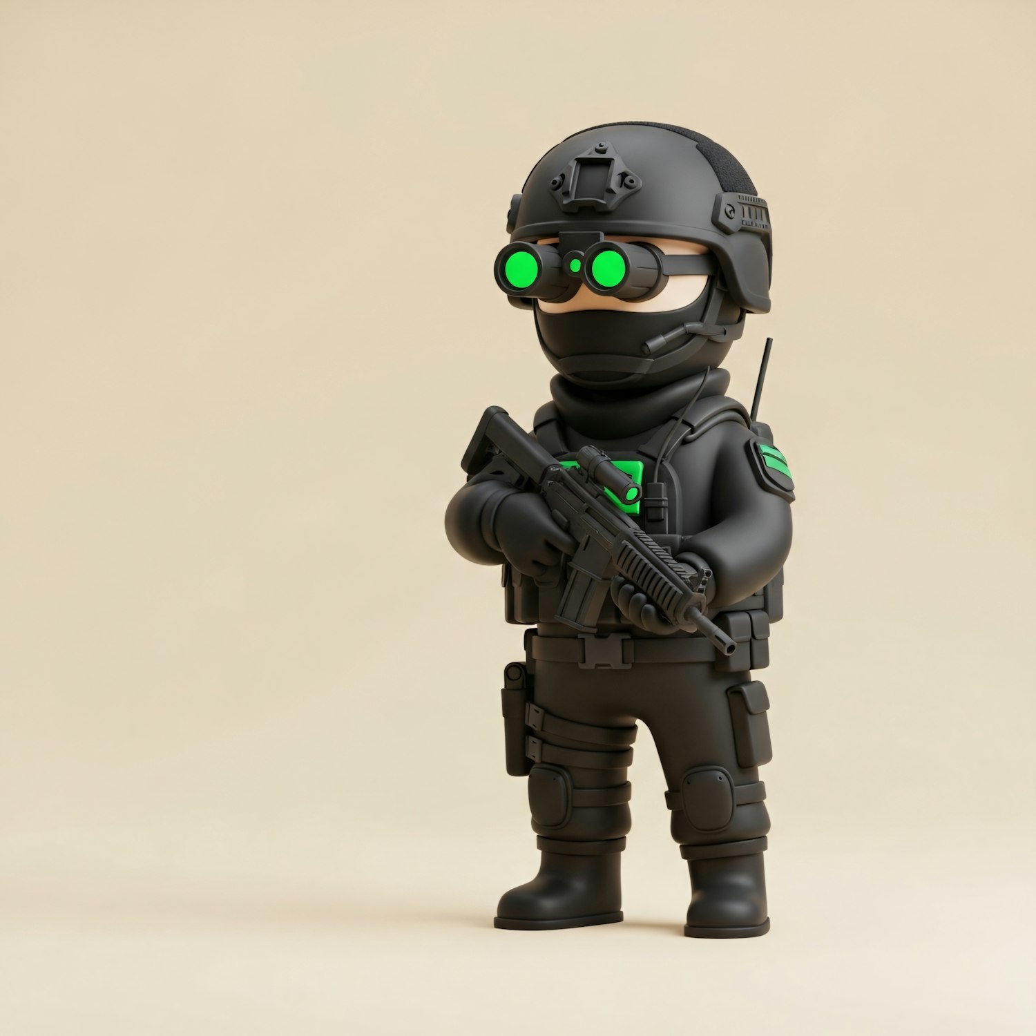 A 3D illustration of a soldier in tactical gear with night vision goggles and a rifle, set against a neutral background.