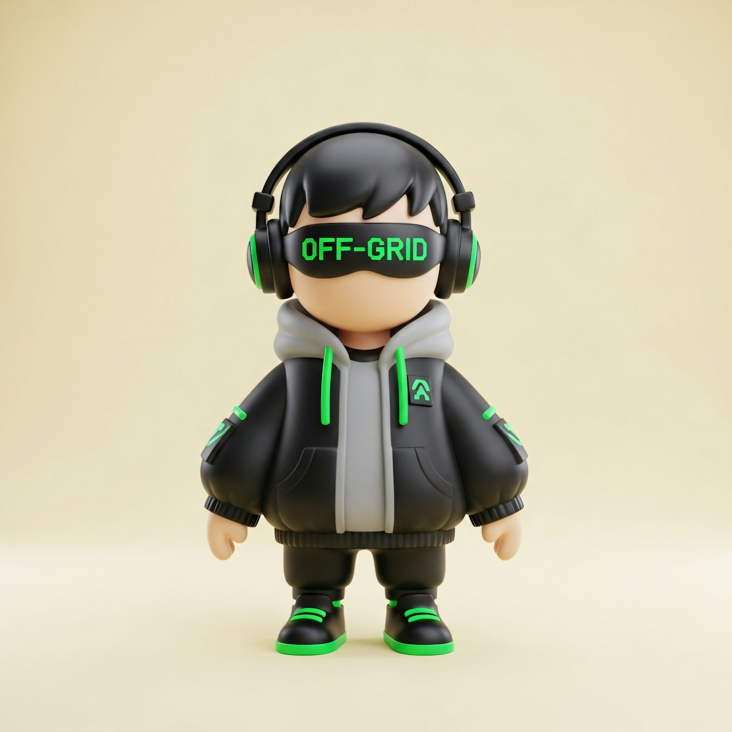 Stylized 3D character in a black and green outfit with a visor reading 'OFF-GRID', showcasing a modern and tech-inspired design.