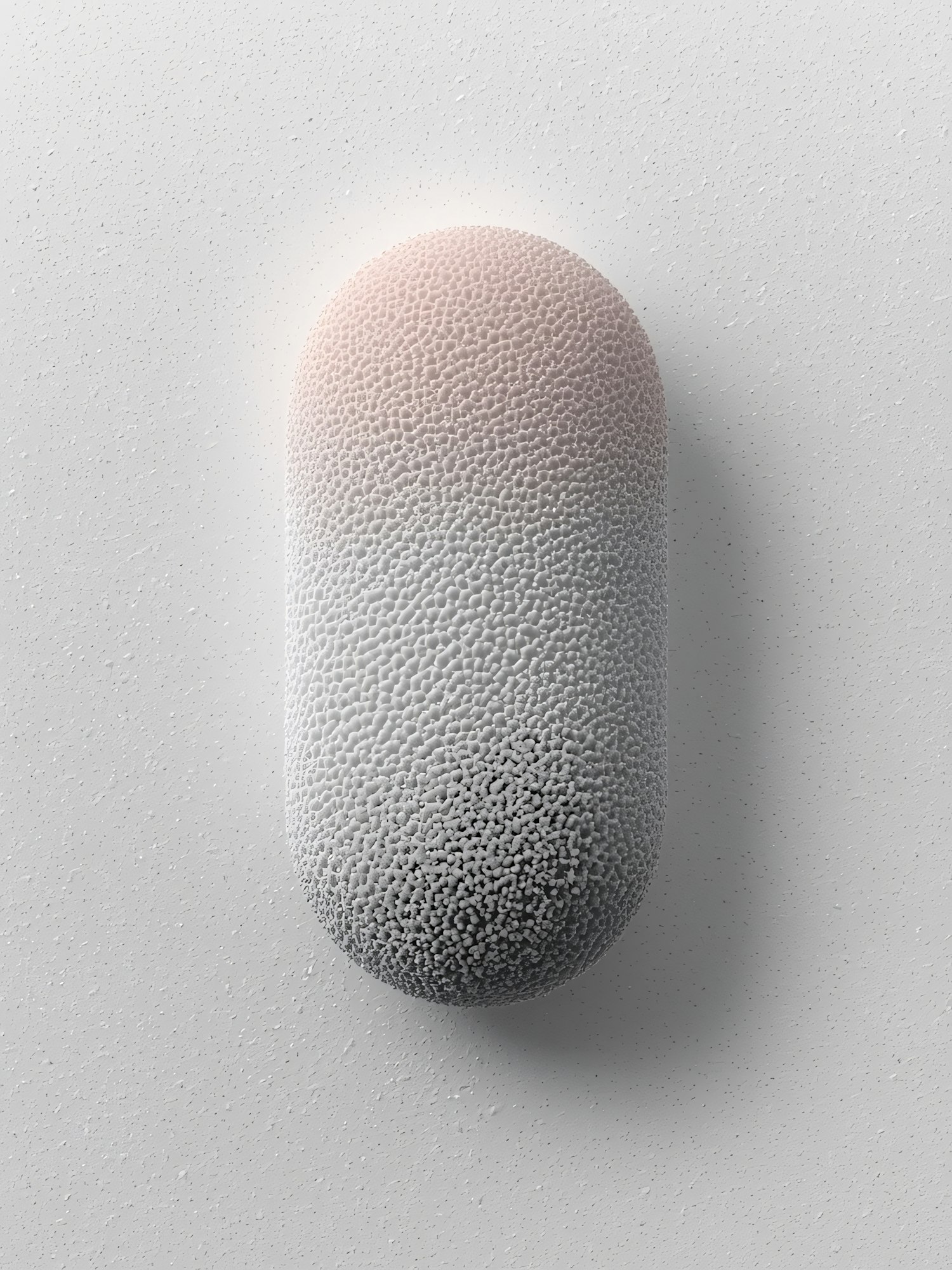 A textured capsule with a gradient from pink to gray on a light gray background, showcasing a minimalistic and modern design.