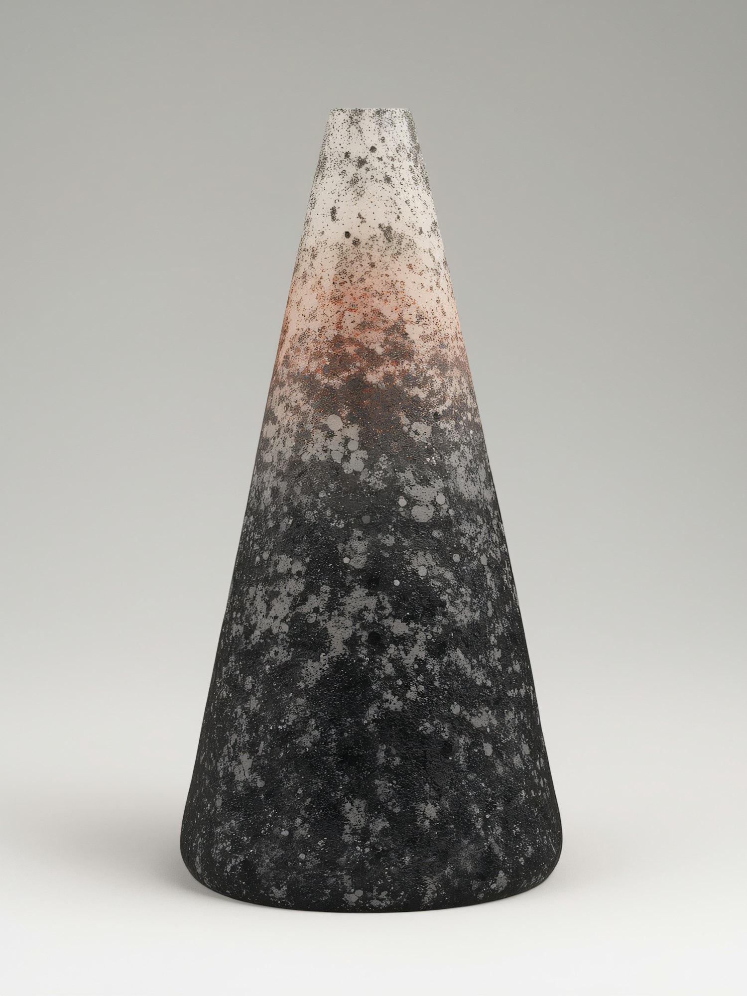 A textured conical vase with a gradient from cream to black, featuring a speckled design, perfect for modern decor.