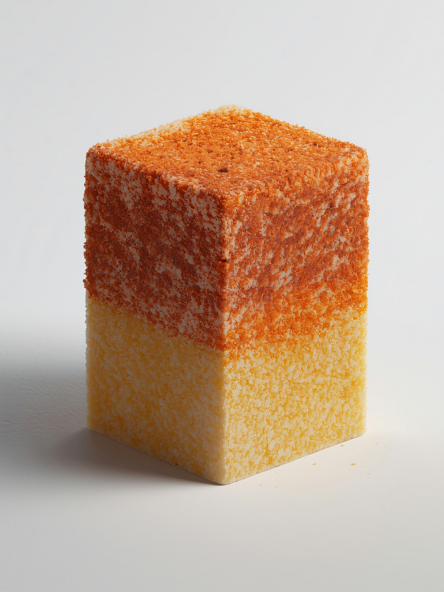 A textured cube with orange and yellow halves on a white background, showcasing vibrant colors and a granular surface.