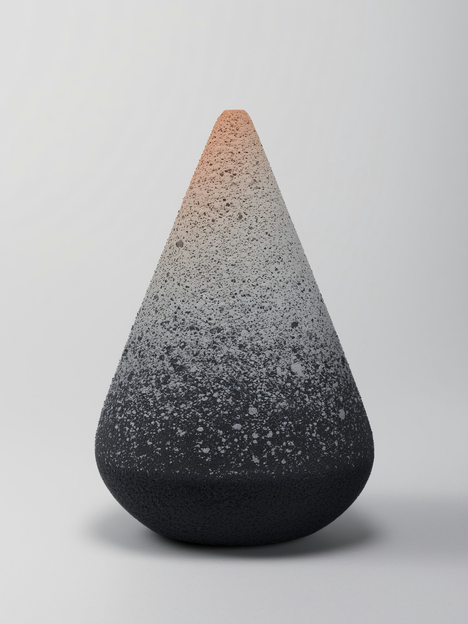 A textured cone-shaped object with a gradient from black to orange, set against a plain background, showcasing its unique design.